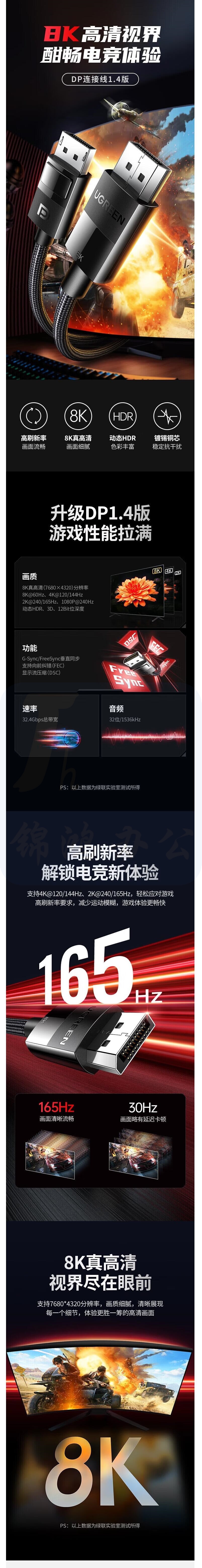 绿联 DP线1.4版4K144Hz 8K高清DisplayPort公对公连接线 2米 连接器 80392