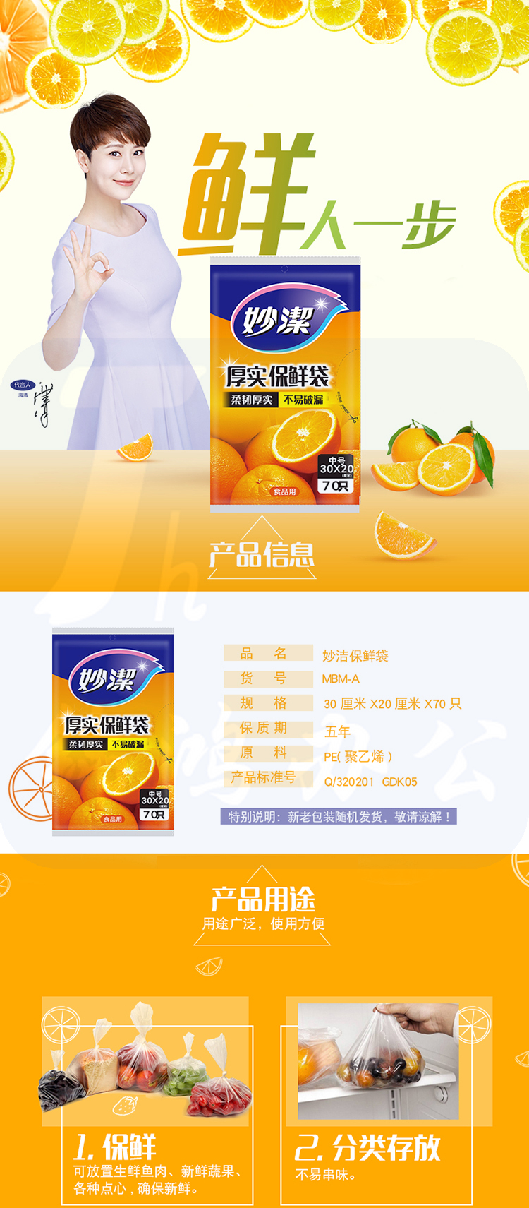 妙洁(MIAOJIE ) 厚实 耐用 抽取式保鲜袋 单包装 中号 70个装