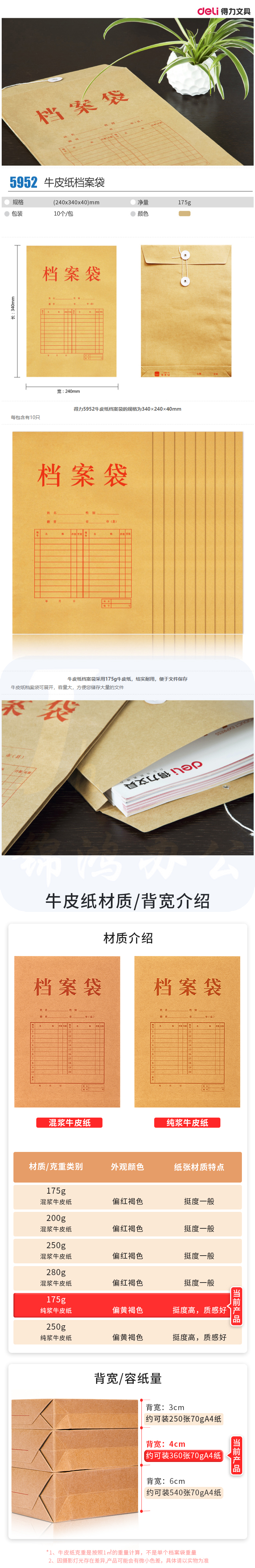 得力5952牛皮纸档案袋(纯浆)(米黄色)(10只/包)