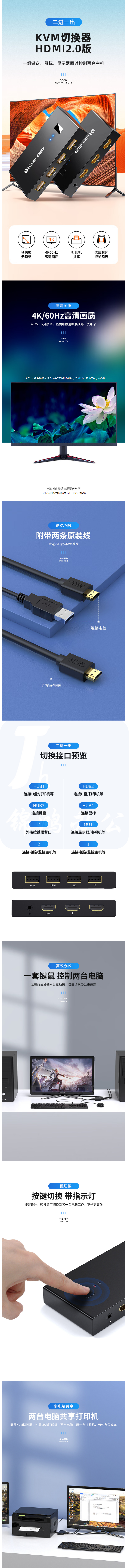 毕亚兹 HDMI KVM切换器二进一出切屏器2.0版 2进1出4K高清 货号:JC