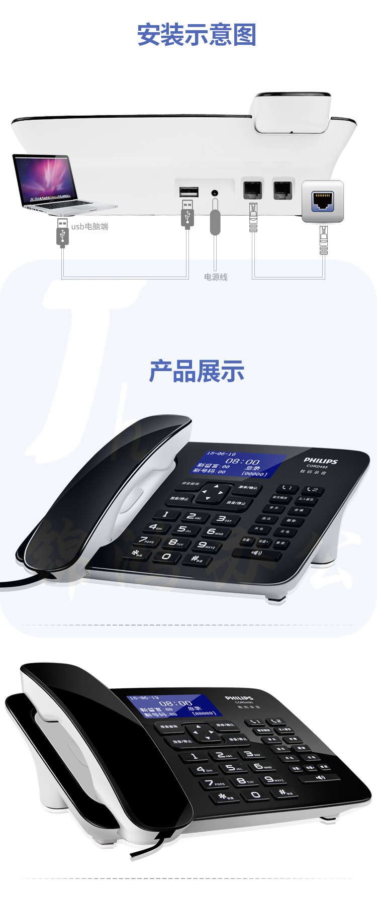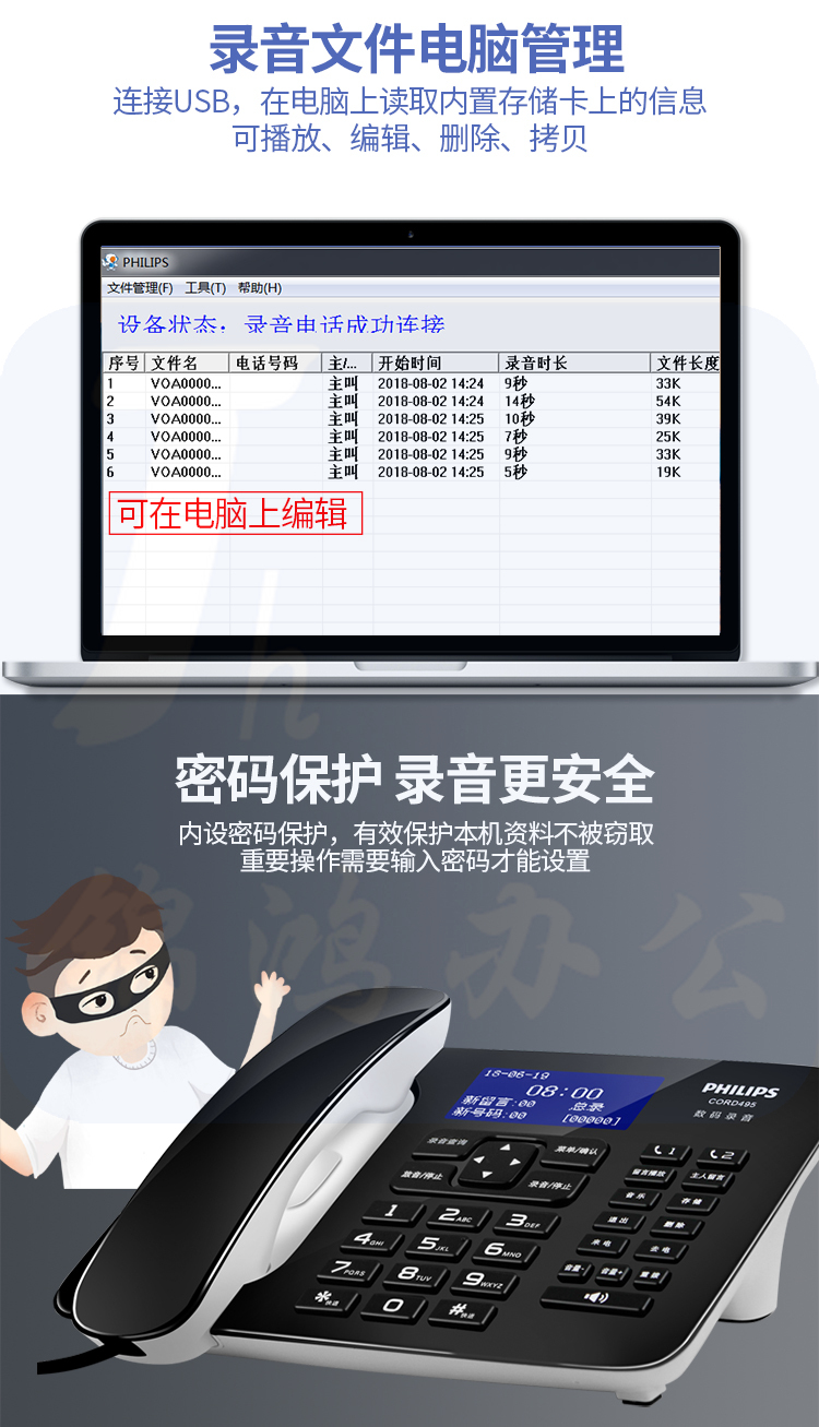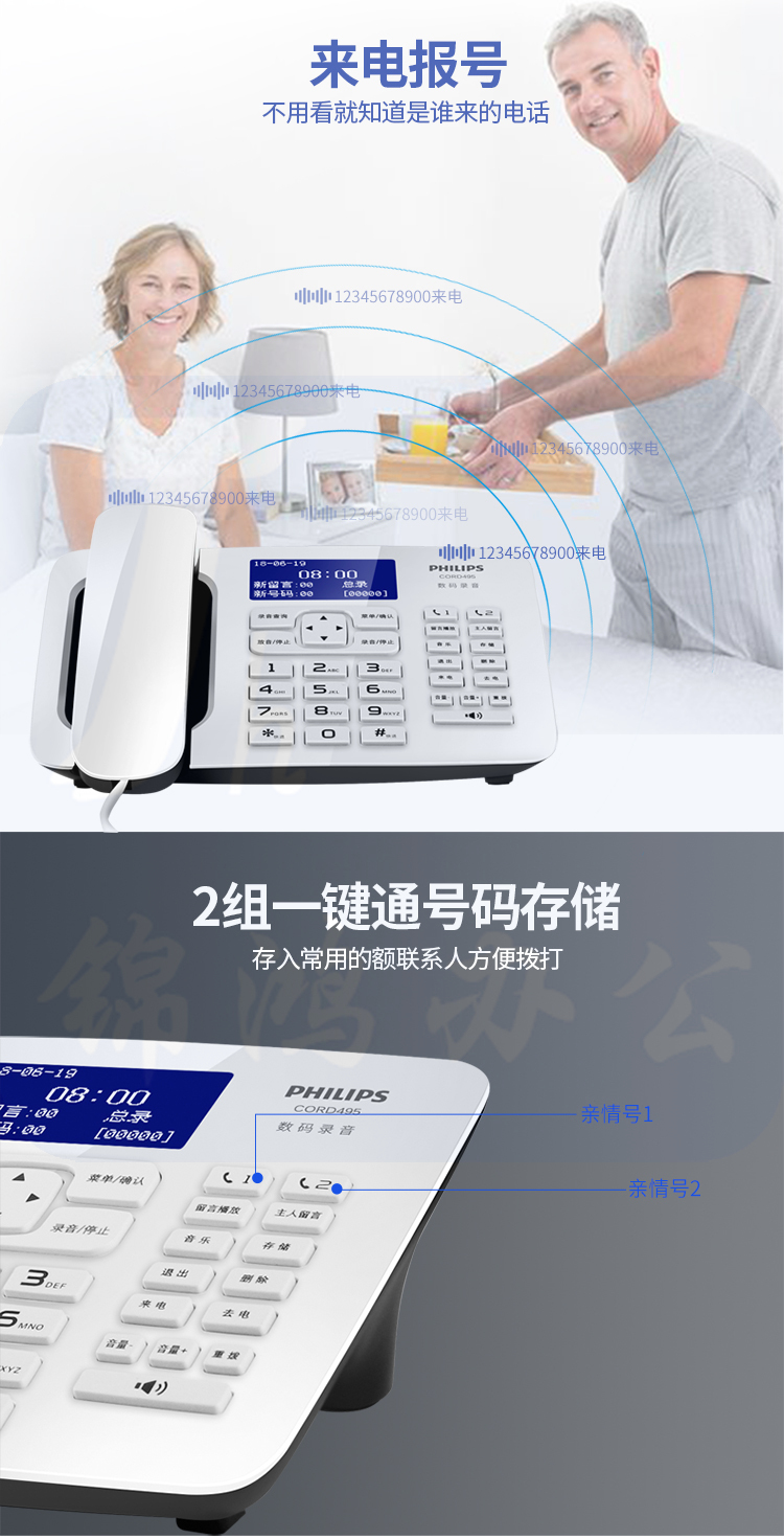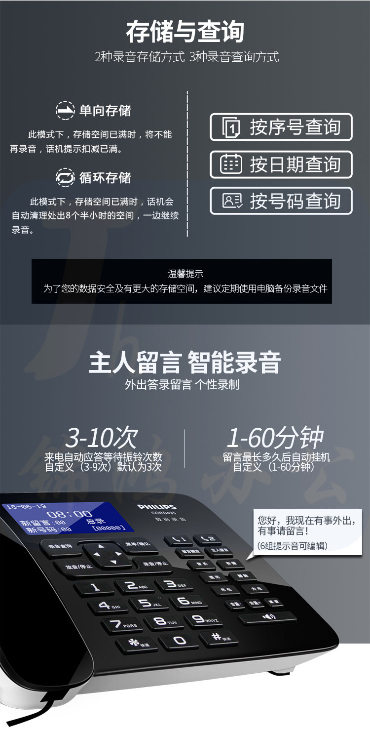 飞利浦(PHILIPS)录音电话机 固定座机 办公家用 中文菜单 自动录音 CORD495黑色