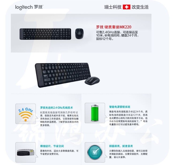 罗技 MK220 无线键鼠套装 带无线2.4G接收器