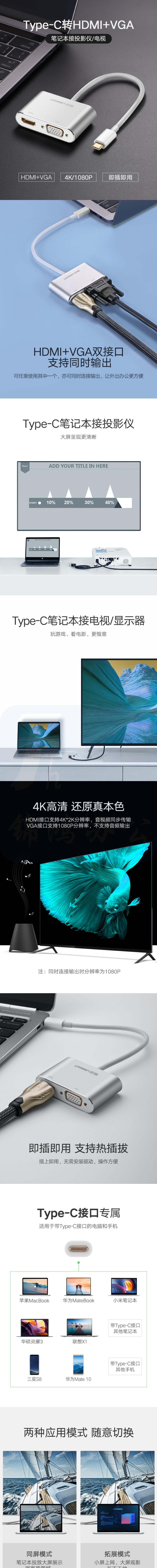 绿联Type-C转HDMI/VGA转换器带PD 50505 15CM