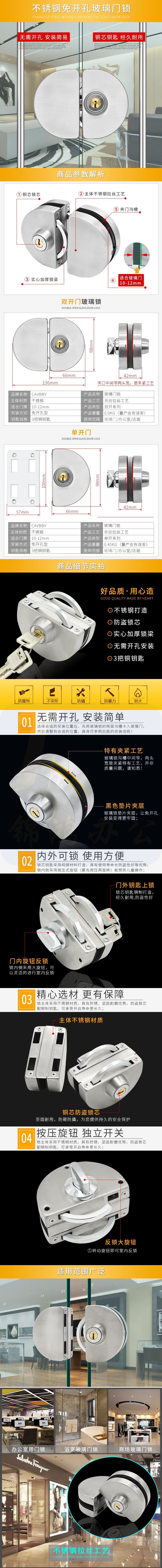 玻璃门锁 推拉玻璃锁 双门免开孔 适用于双边玻璃门,外面钥匙开启内面无