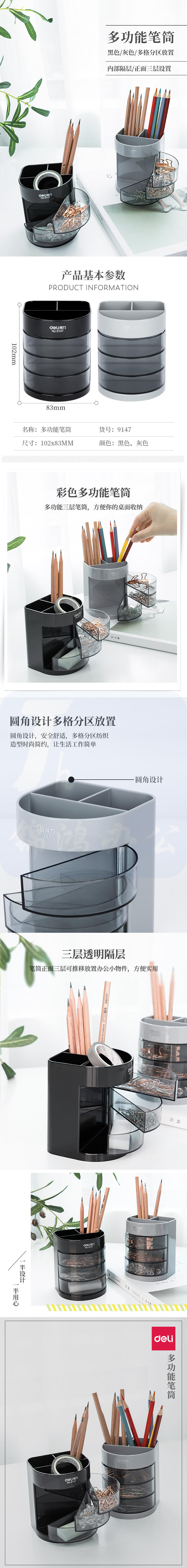 得力(deli)三层多功能办公笔筒 创意桌面收纳盒 黑色9147