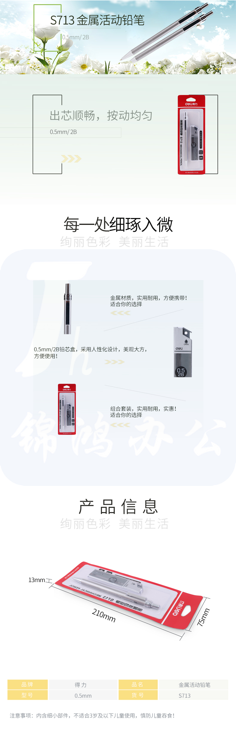 得力S713金属活动铅笔套装 2B0.5-60MM(银)(卡)