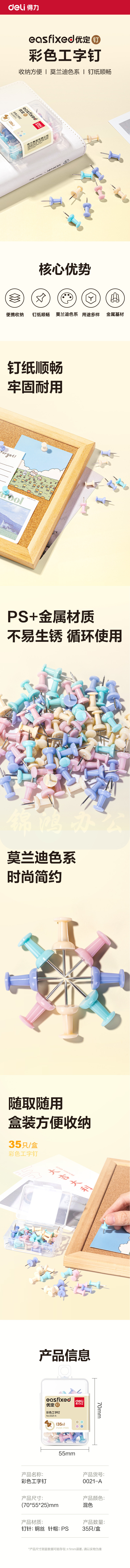 得力(deli)莫兰迪彩色工字钉 软木画板按钉 绘画图钉 可钉墙无痕泡钉 大头钉/照片钉 35枚/盒 0021-A
