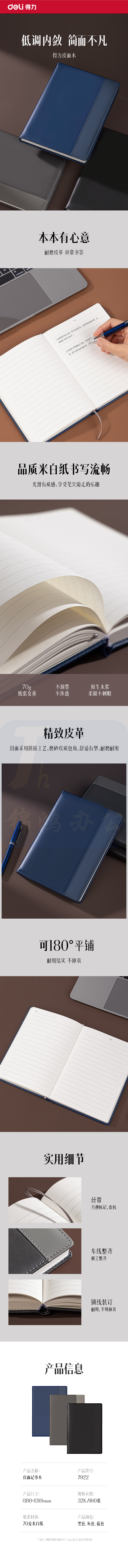 得力(deli)32K160张时尚撞色商务皮面本 会议记事本笔记本蓝色 7922