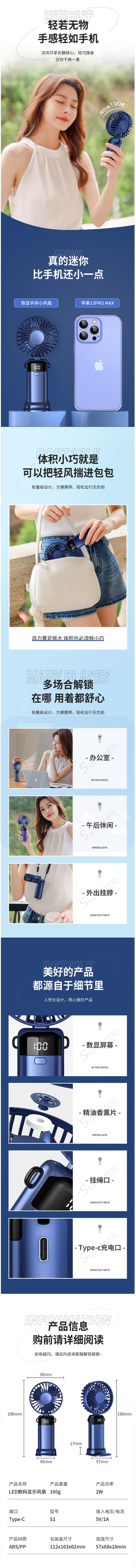 手持小风扇便捷折叠支架usb风扇桌面挂脖式随身小电扇 轻奢蓝丨5档强风丨智能数显丨带底座挂绳