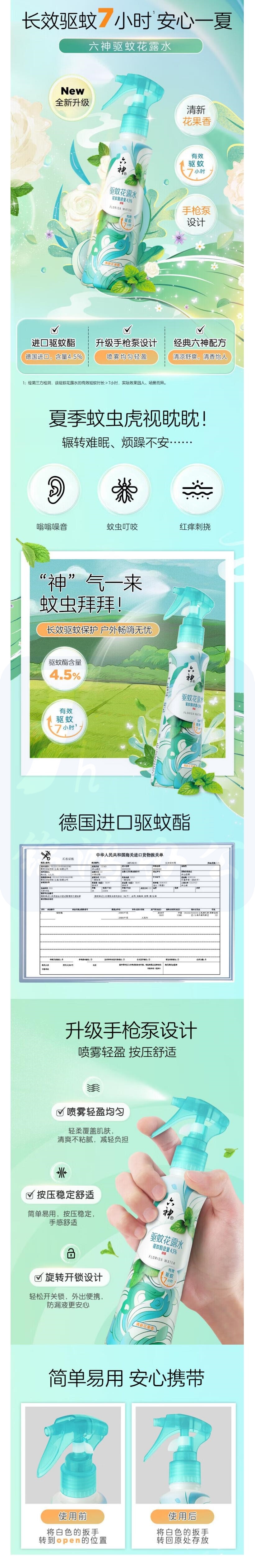 六神 驱蚊花露水清新花果香手枪泵设计188ml 货号:JC