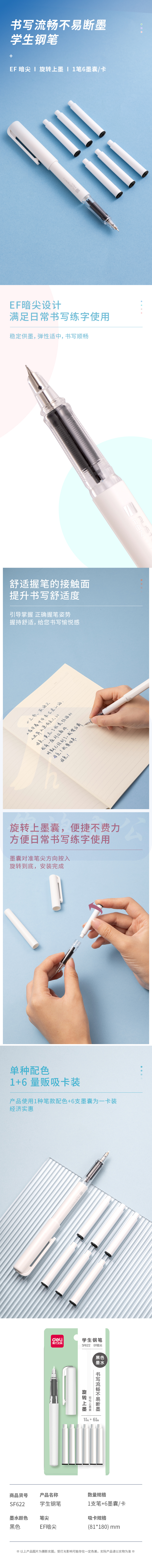 得力(deli)学生钢笔EF暗尖换墨囊钢笔墨水笔 黑 1笔+6墨囊/卡 SF622