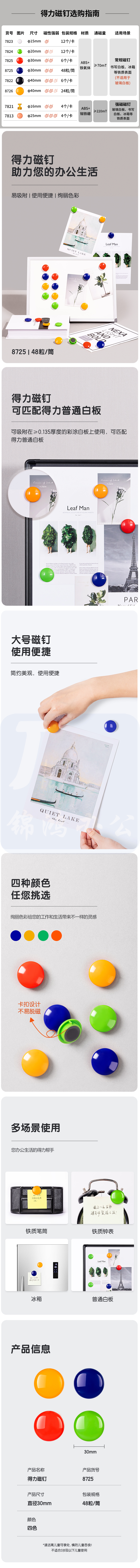得力(deli)彩色白板磁钉磁粒白板磁吸φ30mm 48粒/筒 8725 白板配件