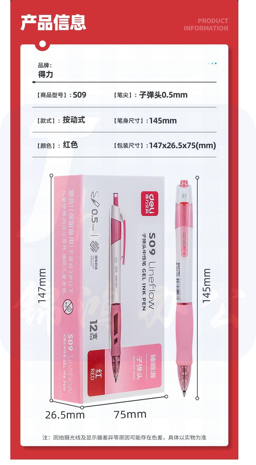 得力S09臻顺滑办公中性笔0.5mm弹簧头(红色)(12支)