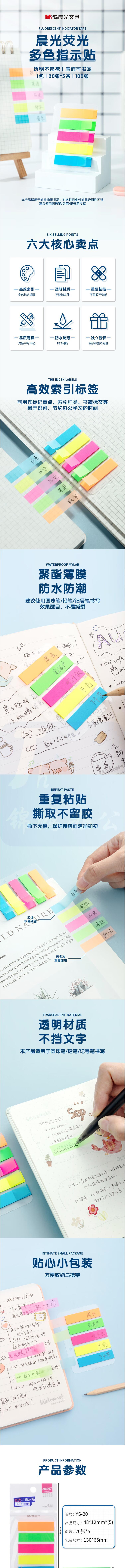 晨光(M&G)5色100枚 荧光便利贴 粘性标签贴姓名贴 记事留言贴优事贴便签 20页/条YS-20