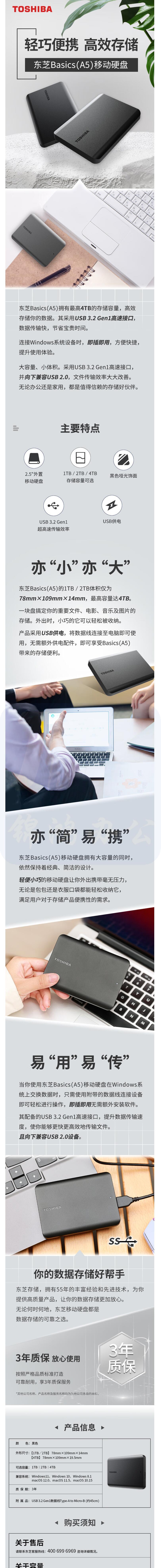 东芝 2TB 移动硬盘 新小黑A5 USB3.2 Gen 1 2.5英寸兼容Mac 数据存储 轻薄便携