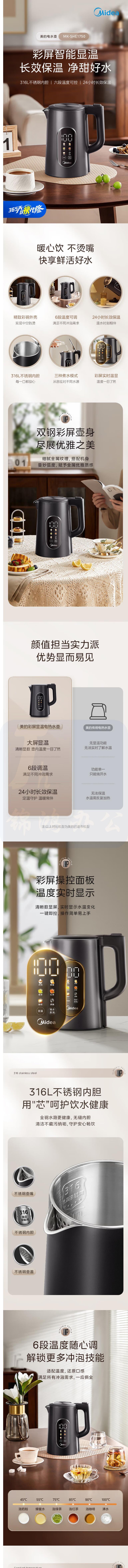美的 1.7L大容量电热水壶烧水壶 触控恒温开水壶SHE1750 货号:JC