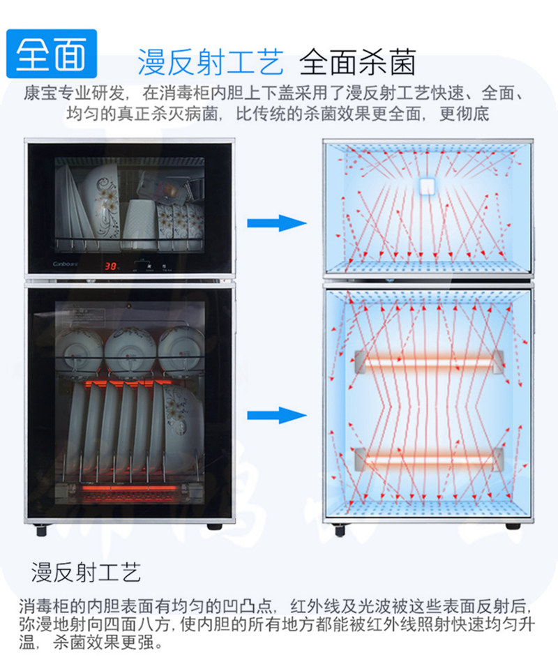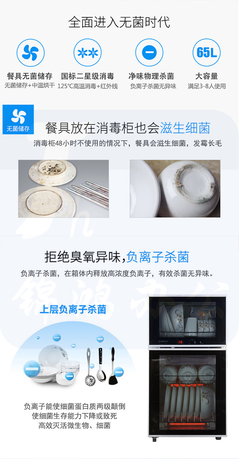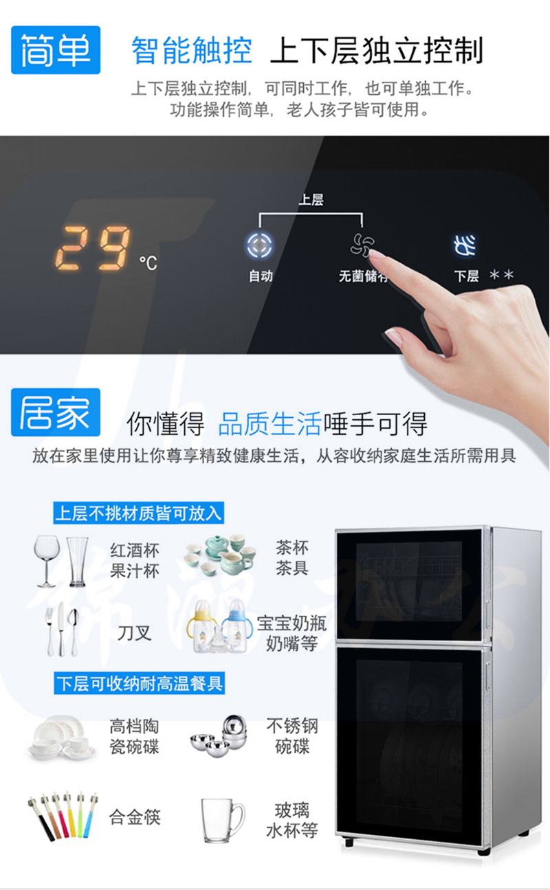 1、尺寸:425*358*800(ZTD80K-2U) 220V-50Hz 700W2、容积(L):80L3、消毒方式及使用场所:4、上层24小时无菌储存,快速除菌器+中温烘干;下层高温消毒5、内胆采用矩形式半球凸点技术,利用漫反射原理,实现360度杀菌无死角6、电脑数码触摸屏幕,带温度显示7、多用途不锈钢层架,碗筷摆放更轻松