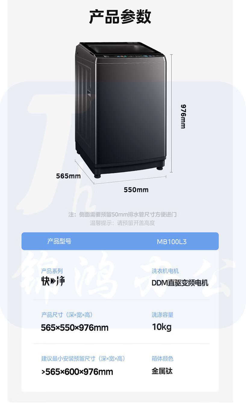 美的 10公斤波轮洗衣机 全自动直驱变频 MB100L1