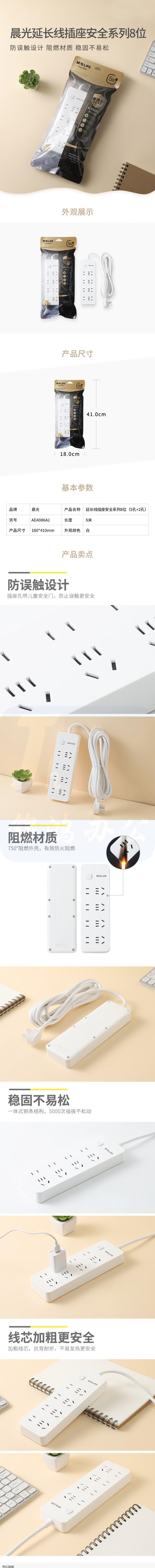晨光 插排 8位总控 3米全长线【5孔+2孔】 新国标接线板延长线插座AEA986A3