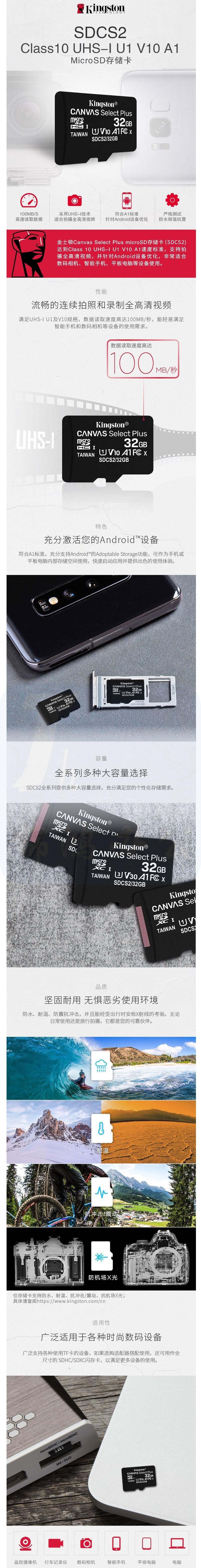 金士顿 行车记录仪内存卡 高速TF(Micro SD) 监控 手机 U1存储卡 100M/S SDCS2 128GB