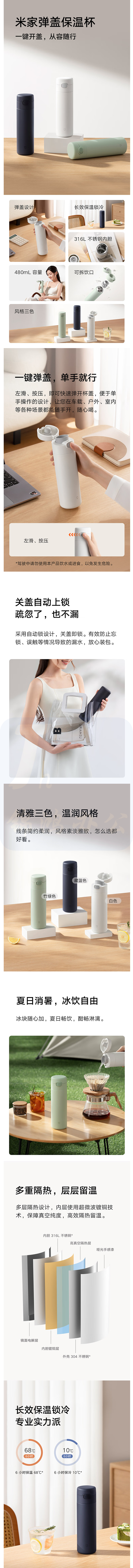 米家 弹盖保温杯 大容量水杯 316L不锈钢 480mL白色