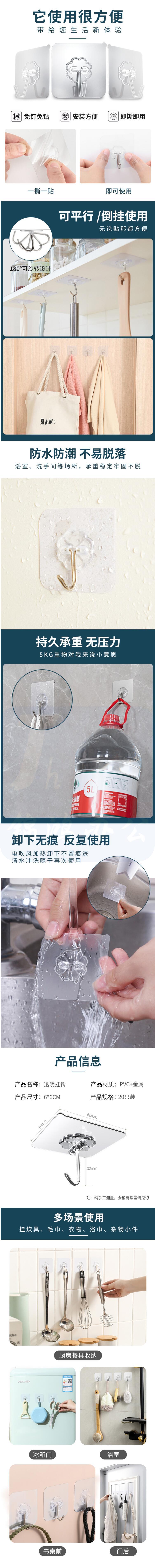 透明粘钩 免打孔强力粘钩 6*6cm 20只/包 单只价格