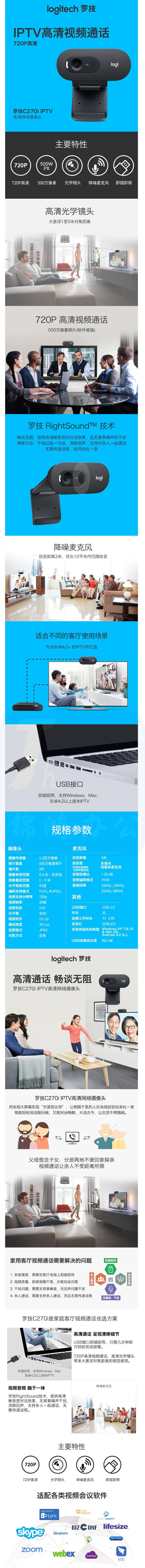罗技 C270i高清摄像头 USB电脑笔记本台式机视频会议直播摄像头