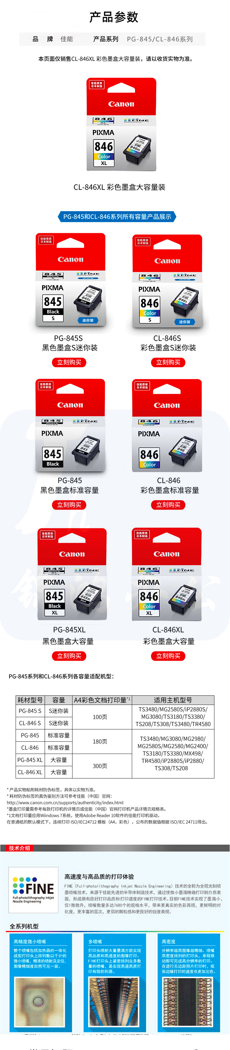 佳能CL-846XL墨盒TS3180/MG2580S/TS308/MG3080 大容量彩色墨盒13ml