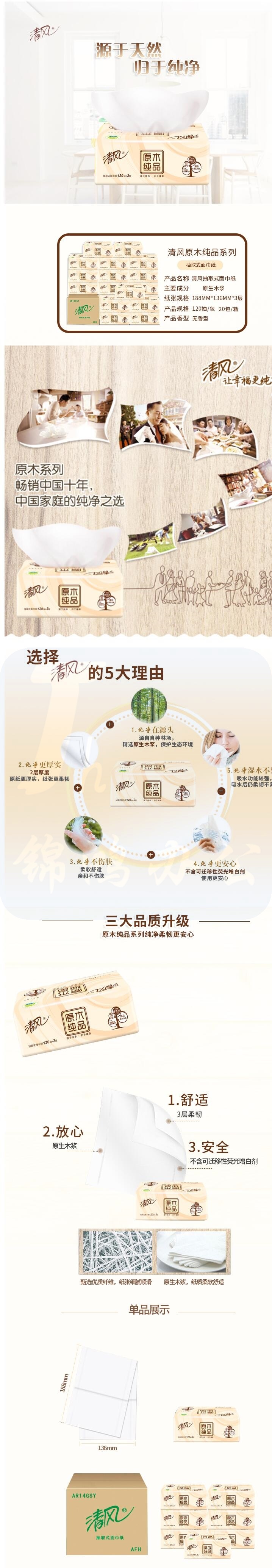 清风 抽纸AR14GSY卫生纸3层120抽面巾纸 20包
