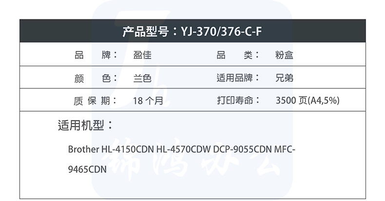 盈佳YJ TN370/376兰粉 适用机型:Brother HL-4150CDN HL-4570CDW DCP-9055CDN MFC-9465CDN