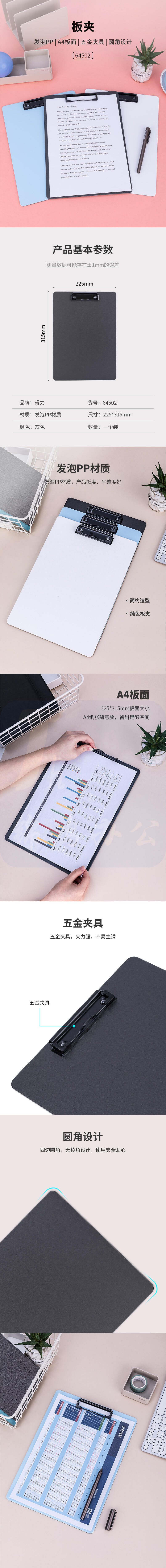 得力(deli)A4书写文件夹板夹金属强力夹夹板写字垫板 64502灰色