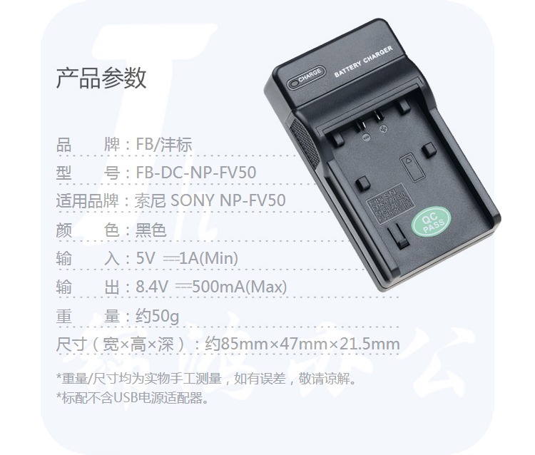 沣标(FB) NP-FV50 电池充电器 For索尼FV70 FV90 FV100 FH70 FH90 FH100 FP90 SX83E