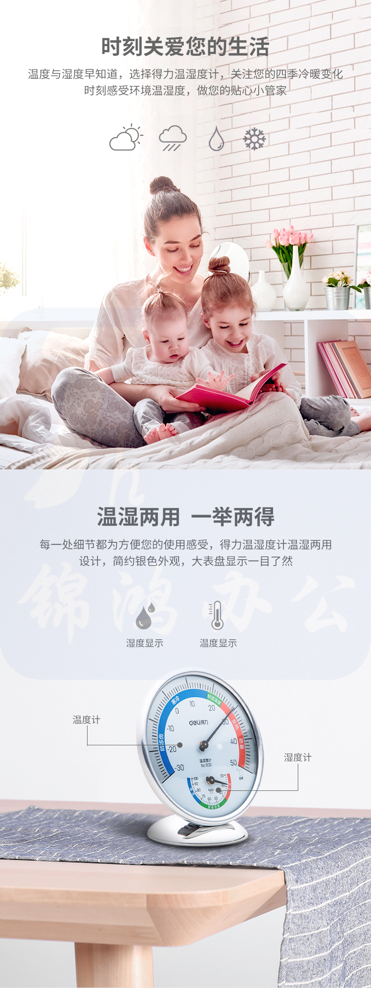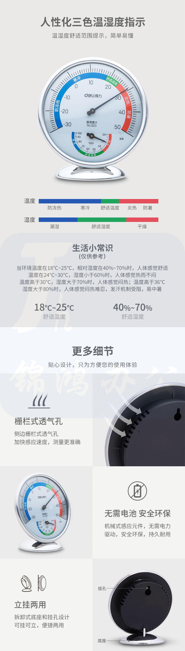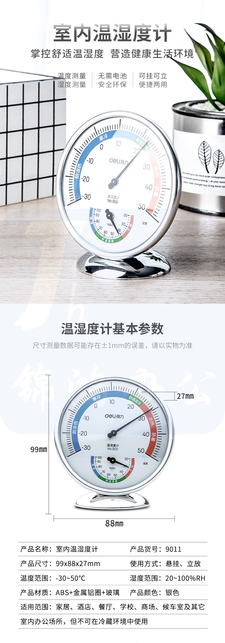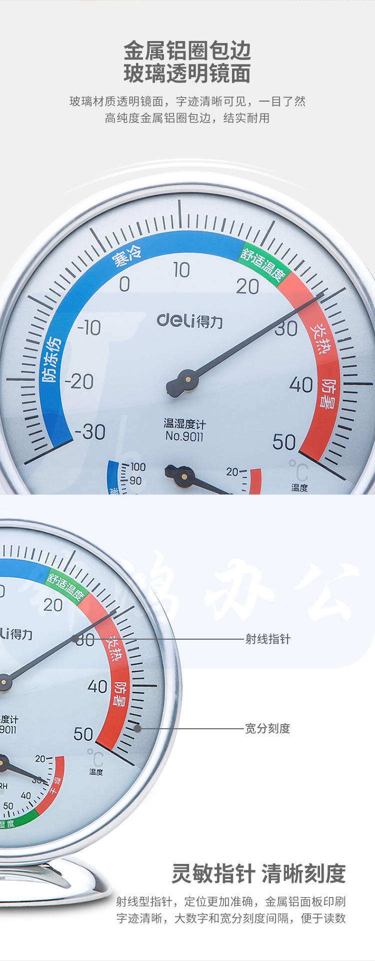 得力(deli)台式免电池室内温湿度计 金属铝圈玻璃镜面三色指示 中号9011
