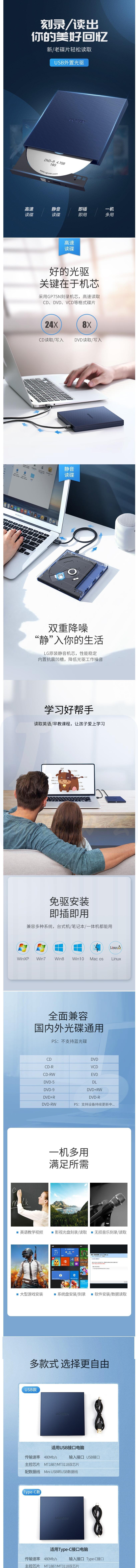 绿联 Type-C外置光驱盘USB-C接台式笔记本电脑刻录机DVD/CD/VCD通用8/CD24倍速 USB款
