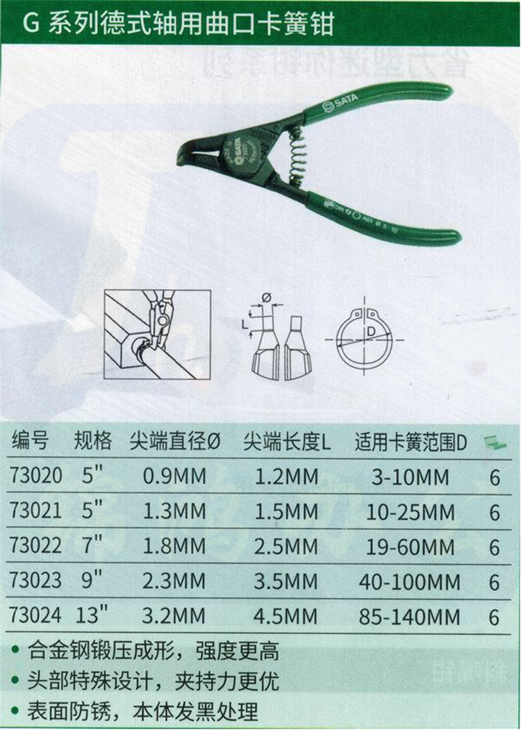 世达(SATA) G系列德式轴用曲口卡簧钳5" (Ø1.3MM) 73021