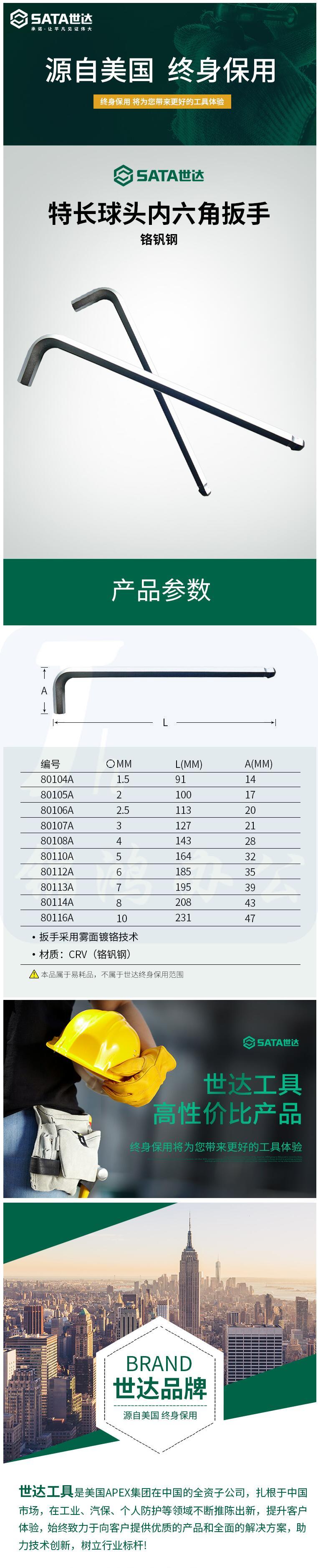 世达 80114 铬钒钢 特长球头内六角扳手8mm
