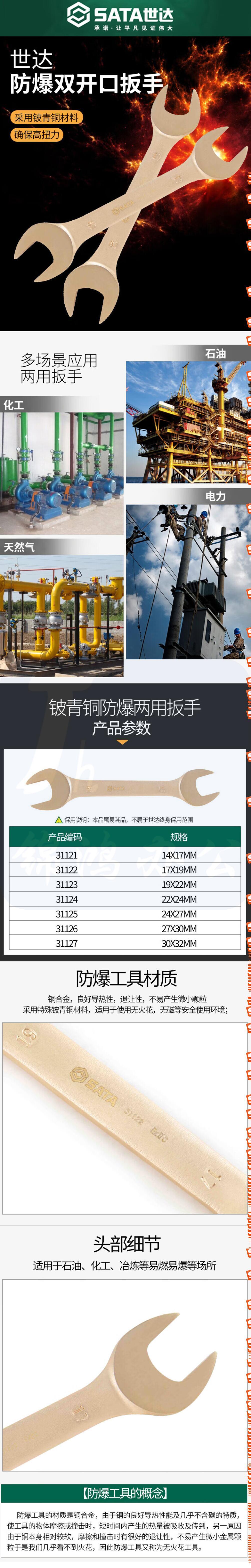 世达 31122铍青铜防爆开口扳手17x19MM 呆扳手铜扳子