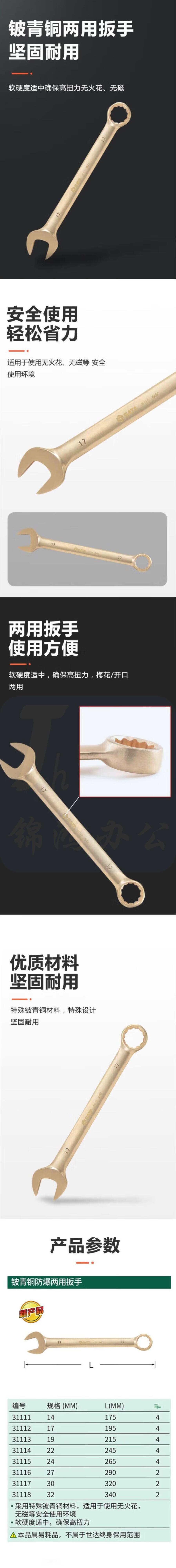 世达 31113 铍青铜防爆两用扳手19MM 呆梅扳手
