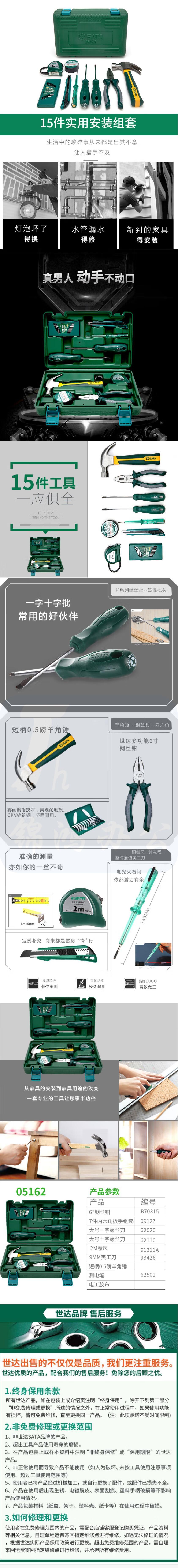 世达 05162 工具套装15件螺丝刀扳手内六角锤子组套工具工具箱