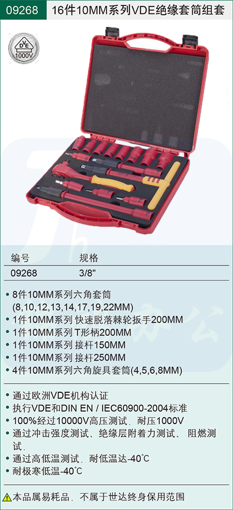 世达(SATA)16件10MM系列VDE绝缘套筒组套货号09268