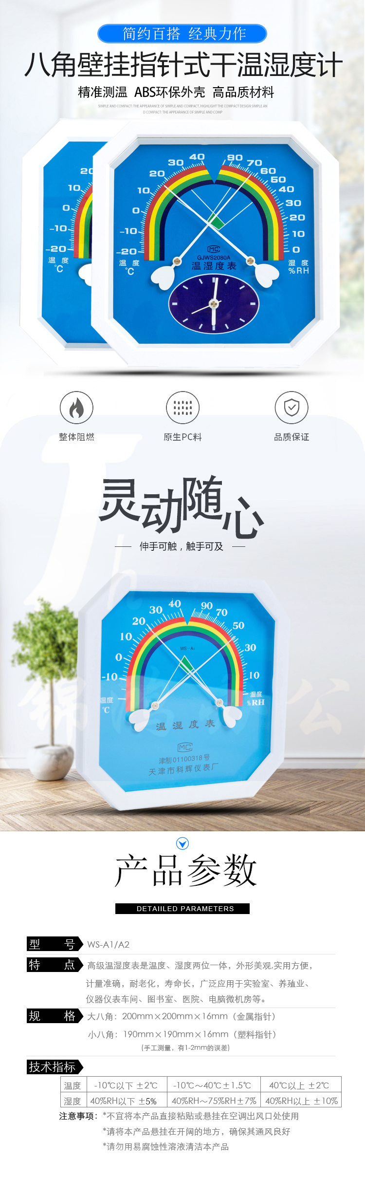 八角指针式干温湿度计壁挂式温湿度表