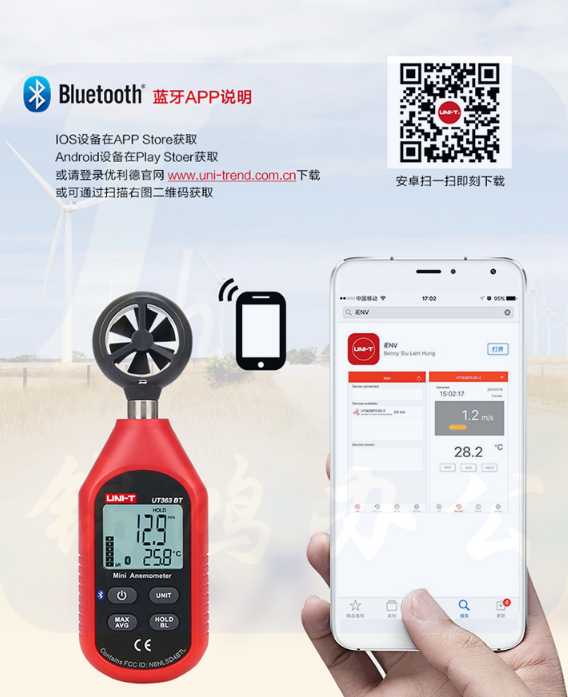 优利德(UNI-T)迷你风速仪手持式蓝牙版测风仪 UT363BT