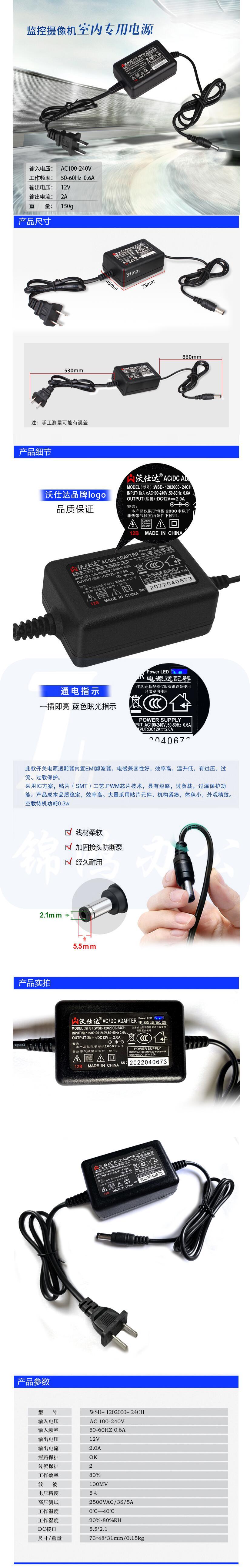 沃仕达 监控电源12V2A 高清摄像机安防设备室内通用12V电源适配器 货号:JC