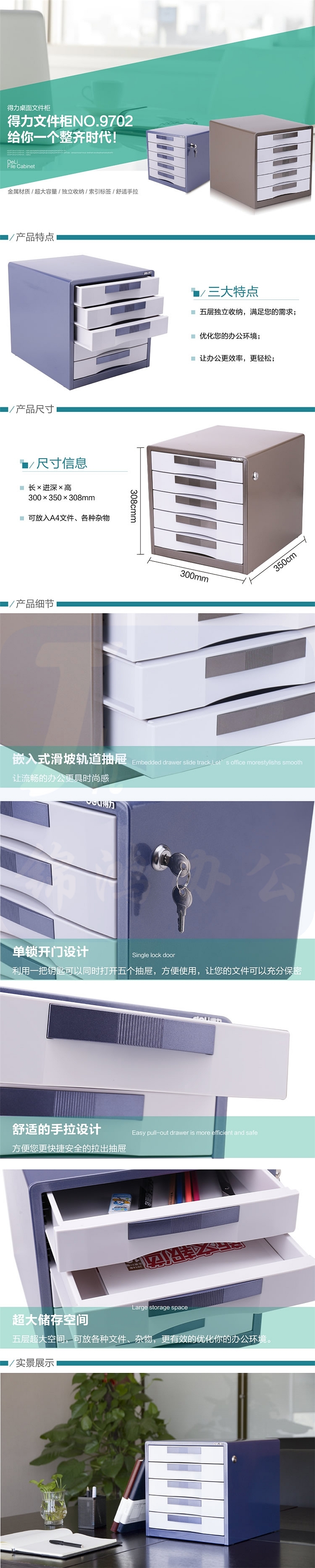 得力 9702 五层桌面金属收纳柜 350x300x308m 闪银蓝