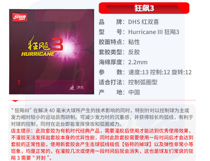 红双喜DHS 省套蓝海绵狂飙3套胶 乒乓球胶皮反胶 黑色 39度2.2mm 货号:GD