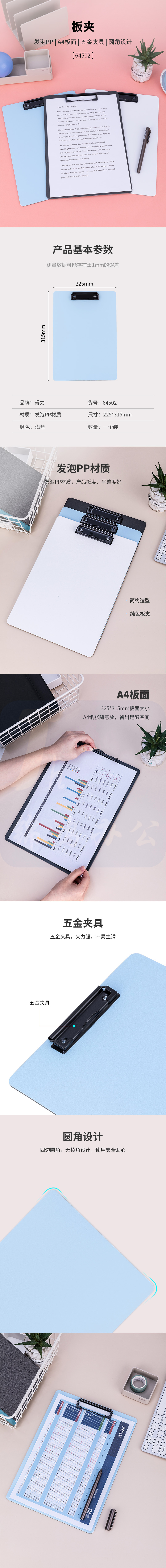 得力(deli)A4书写文件夹板夹金属强力夹夹板写字垫板 64502浅蓝色