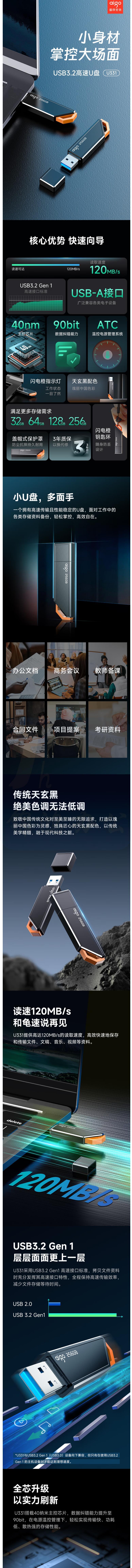 爱国者 USB3.2 Gen1高速U盘 U331 256GB 轻巧便携优盘 读速120MB/s 货号:WY