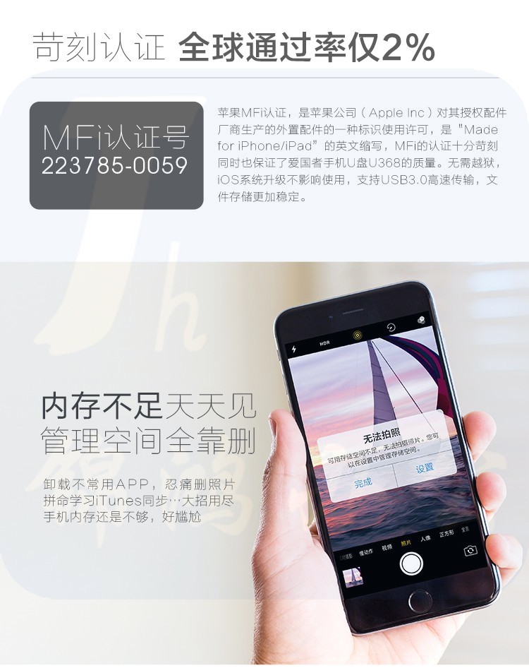 爱国者 64GB Lightning USB3.0 苹果U盘 U368精耀升级版 银色 苹果官方MFI认证 手机电脑两用