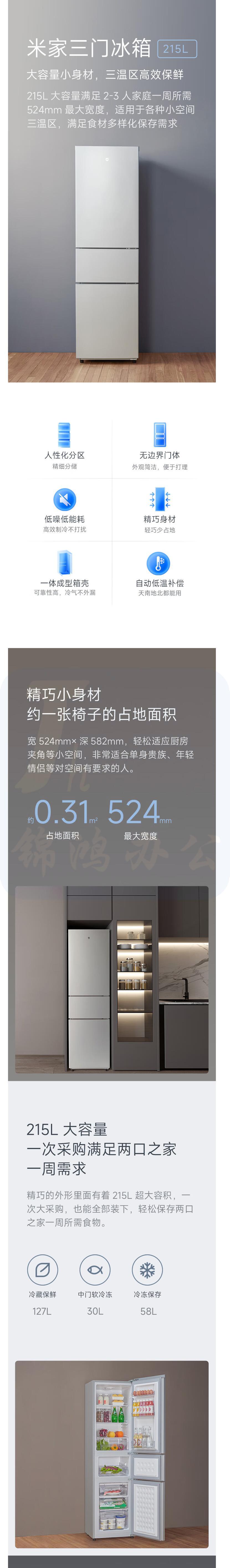 小米 215升 三门小型家用电冰箱 BCD-215MDMJ05 货号:JC