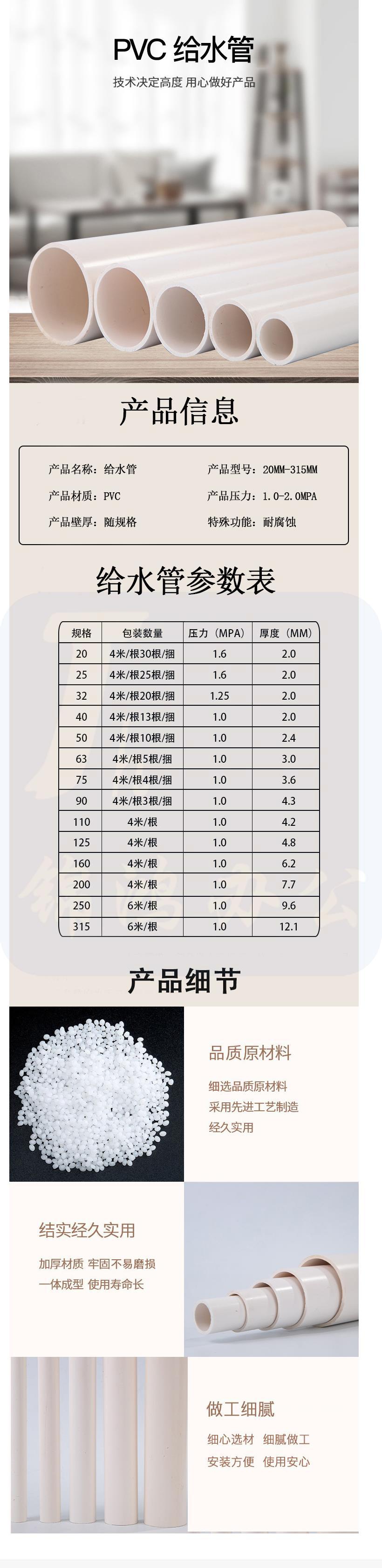 PVC水管 给水管 排水管 PVC管40mm 3米/根 货号:JC